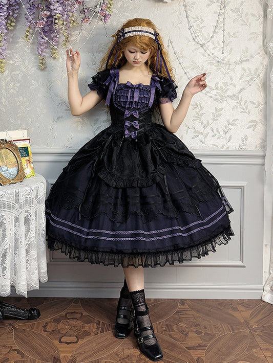 Schwarz-lila Jacquard-Rock mit Kordelzug und quadratischem Ausschnitt, klassisches Lolita-Kleid