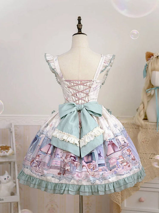 Süßes Lolita-Kleid mit Kätzchen und grünen Schleifen, flatternden Schultergurten, Pulloverrock