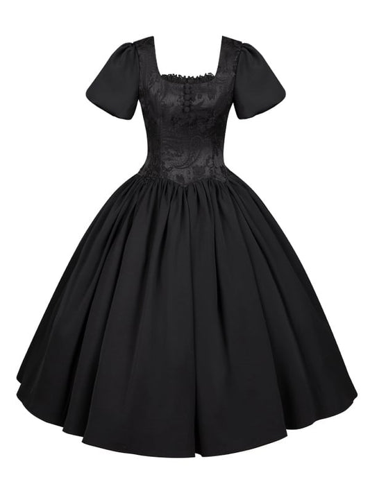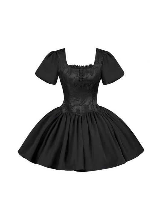 Schwarzes, elegantes Lolita-Kleid mit entbeinter Taille und quadratischem Ausschnitt, kurze Version