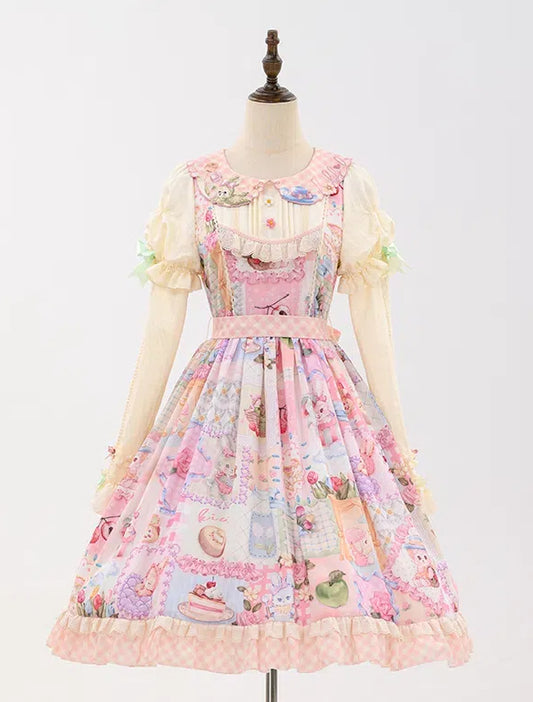 Süßes Lolita-Kleid im Cottagecore-Patchwork-Stil mit Hasenstickerei-Kragen und abnehmbaren Ärmeln