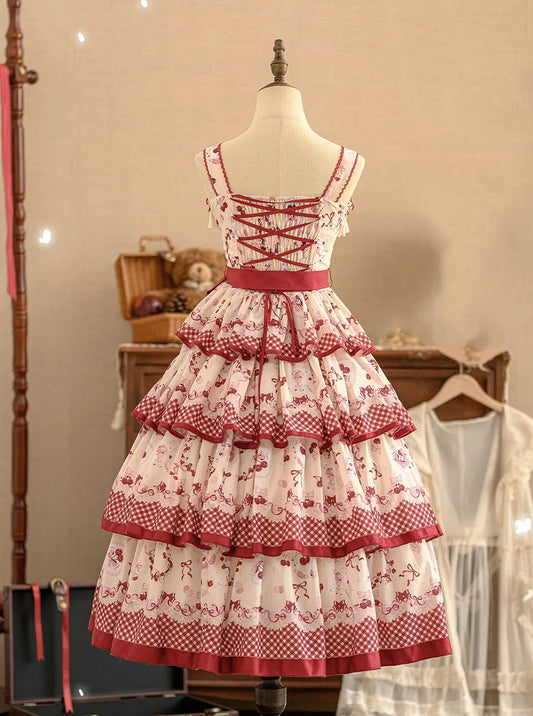 Teelanges Lolita-Kleid im Cottagecore-Stil mit roten Kirschen und Gingham-Muster und gestuftem Saum