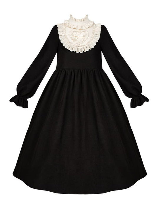 Beigefarbener Rüschenausschnitt, schwarzes Lolita-Kleid mit hoher Taille und langen Ballonärmeln, lange Version