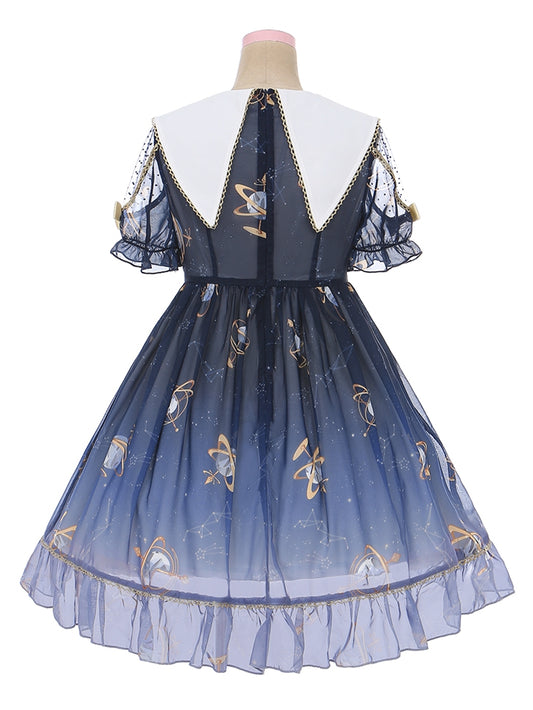 Marineblaues Lolita-Kleid mit Himmelskugel und Sternenschleife und Volantsaum