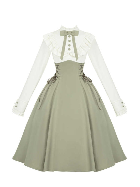 Hellgrüner und beigefarbener Rüschenausschnitt, lange Ärmel, klassisches Frühlings-Lolita-Kleid, gefälschter Zweiteiler