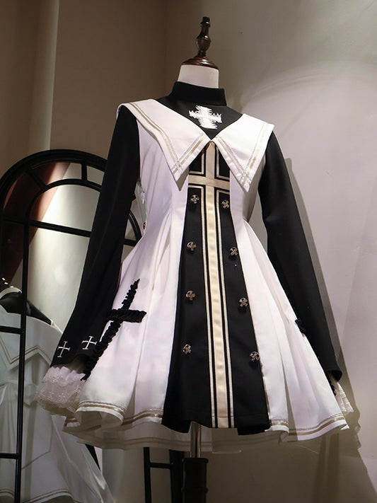 Weißes und schwarzes Lolita-Kleid mit Kreuzdetails und Glockenärmeln