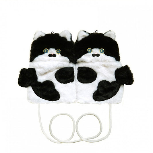Schwarz-weiße süße Plüschhandschuhe in Katzenform