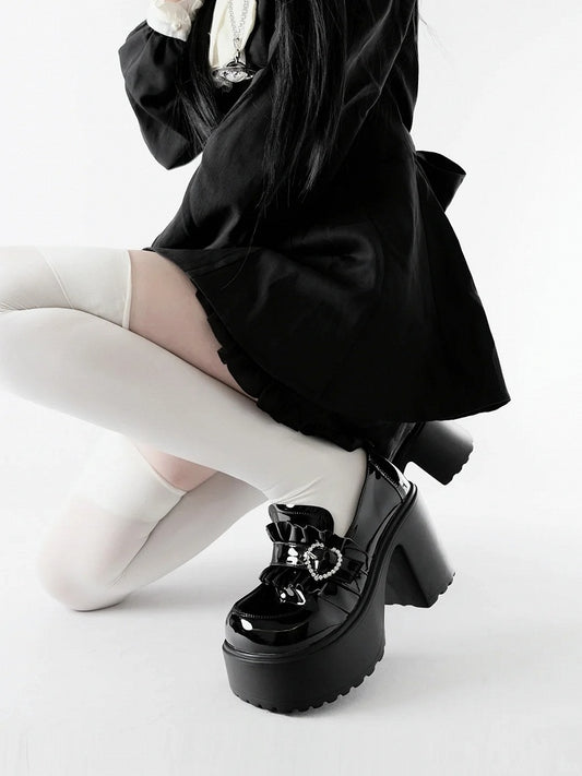 Polierte 6 cm Jirai mit schwarzen Loafers, Strass-Sweetheart-Schleifen-Plateau und Kei-Absatz
