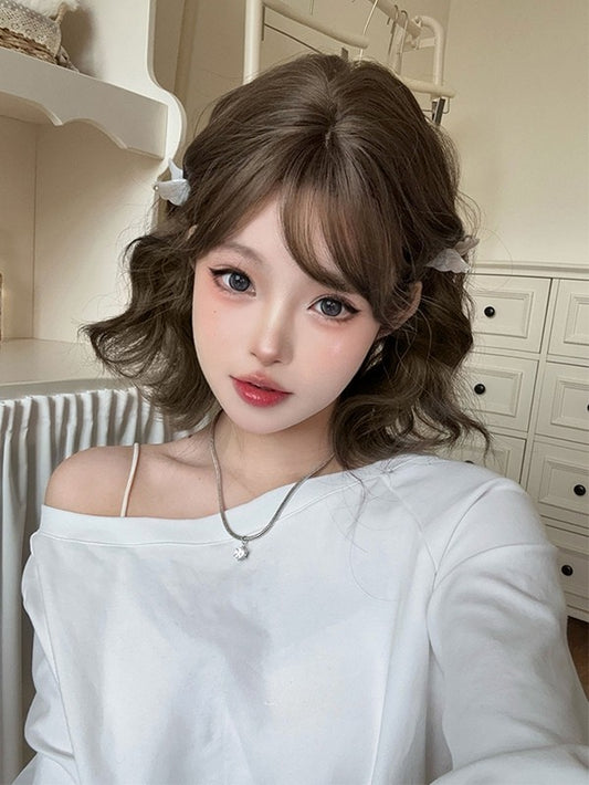 Perücke Braun/Braun/Schwarz Clips Kurze Klaue Mit Doppel Roman + Pferdeschwanz Licht Lockige Pony 50CM