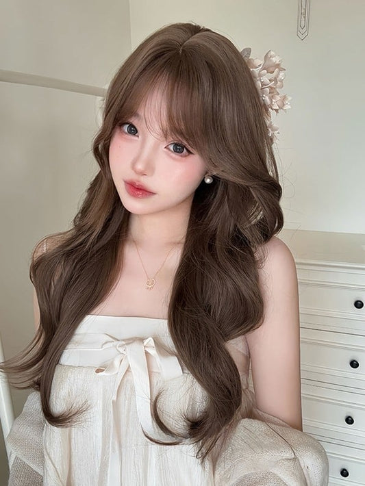 Gewellte 71CM braune Air-Perücke mit Pony und Länge