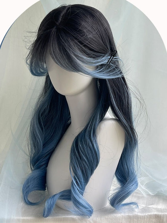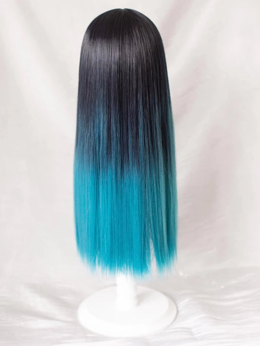 Ombre Blue Bangs Wellige schwarze Perücke 65CM und mit Länge