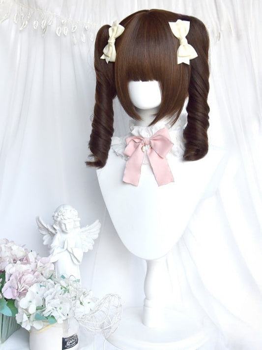 Dunkelbraune Perücke im Bob-Schnitt mit Pony und doppelten, lockigen Pferdeschwanzklammern