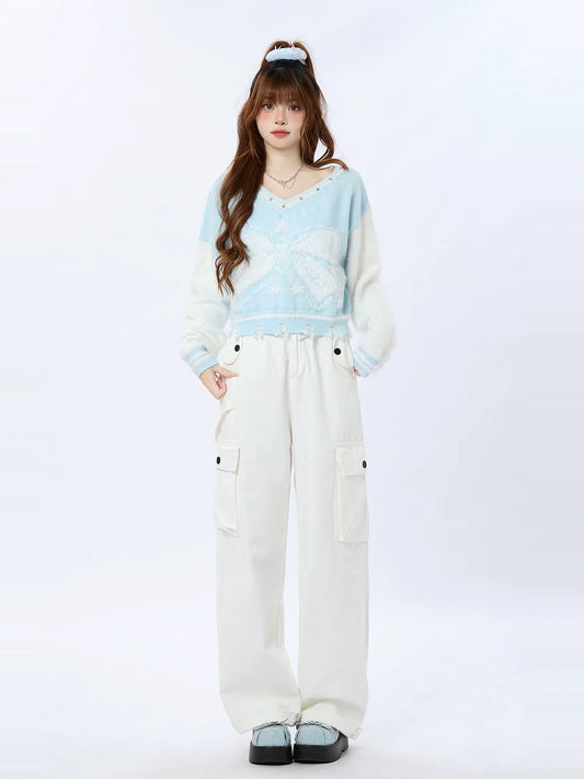 Kurzer V-Ausschnitt mit Schleife und amerikanischem Colorblock-Strickstern