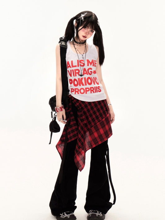Hose mit Kätzchen-Plüschtier, rot kariert, elastische Taille, weites Bein, lässig