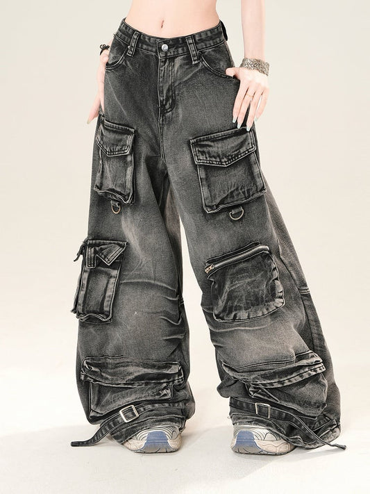 Schwarze Jeans mit weitem Bein und Cargotaschen