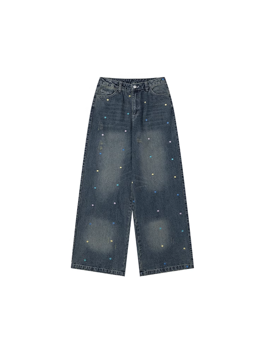 Dunkelblaue Distressed-Jeans mit weitem Bein und buntem Tupfenmuster