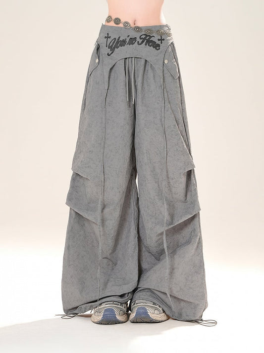 Grau/schwarze Hose mit weitem Bein und niedriger Leibhöhe und Spitzen-Accessoire an der Taille