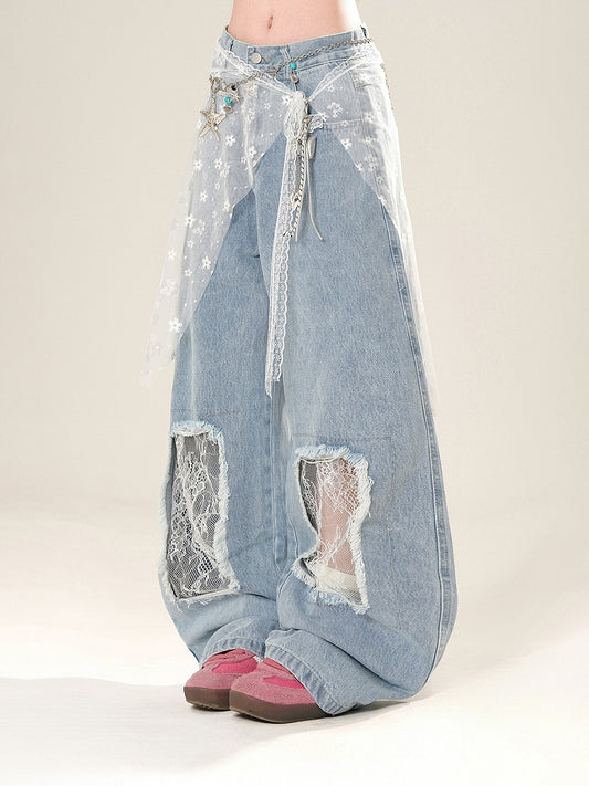 Spitzen-Taillen-Accessoire-Patches Blaue Jeans mit weitem Bein und Löchern in der Taille