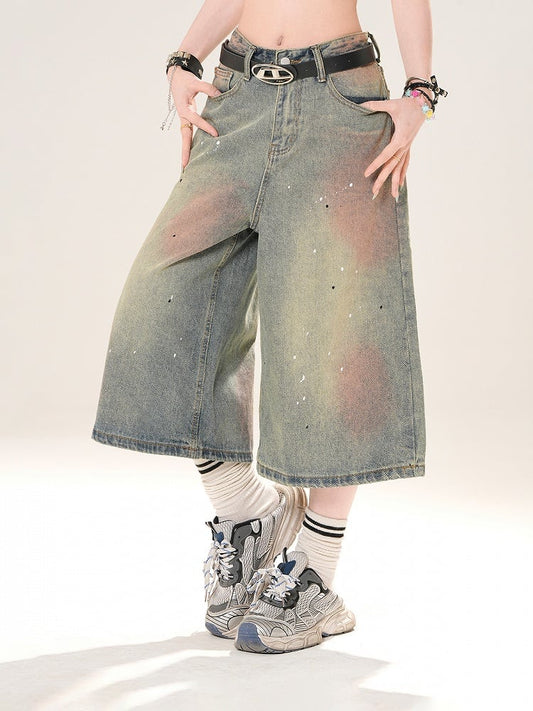 Weite Jeans mit Rissen und Löchern im Used-Look, Spray Blue Low Print Paint
