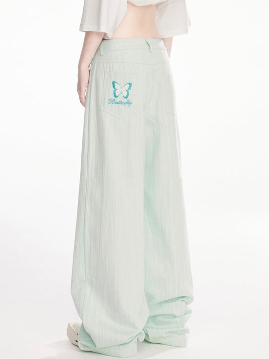 Mintgrüne Hose mit weitem Bein und niedriger Taille und Schmetterlingsstickerei