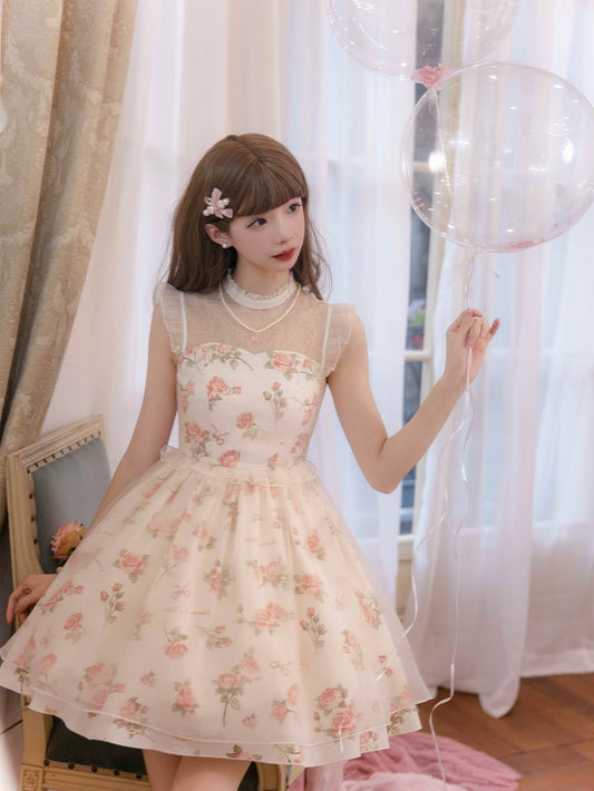 Kleid Rosa Print Rosette Weiß Illusion Lolita Sommer Ausschnitt