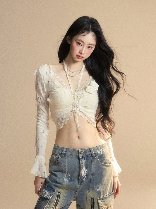 und floral verzierte Spitze Apricot Glockenärmel Schmetterling Set Cropped Top Glamouröses Top mit