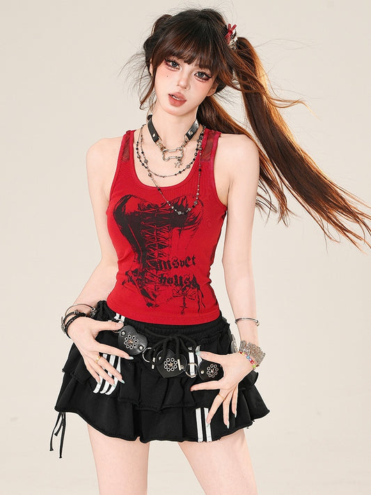 Rock mit Lolita-Korsettträgern, rotem Idol, hohem schwarzem Punk-Gürtel und kaskadierender Rüsche in der Taille