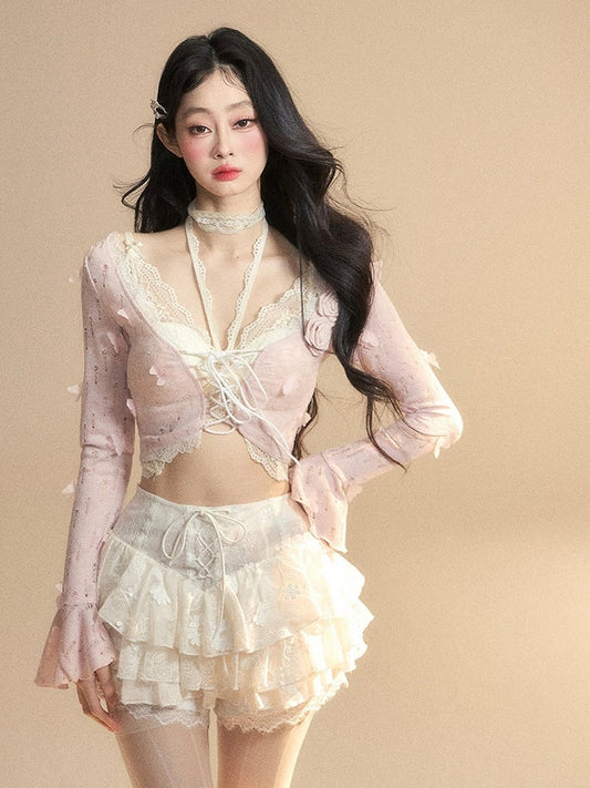 Kurzes Top mit Blumenmuster, rosa Glockenärmeln, Schmetterling, glamourös und Set mit Top-Verzierung aus Spitze