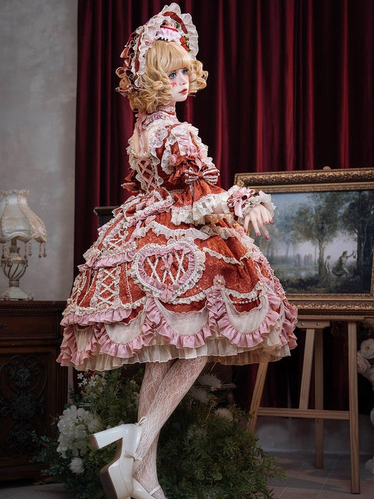 Rotes Rosette-Prinzessin-Lolita-Kleid mit Kordelzug-Overlay-Rock