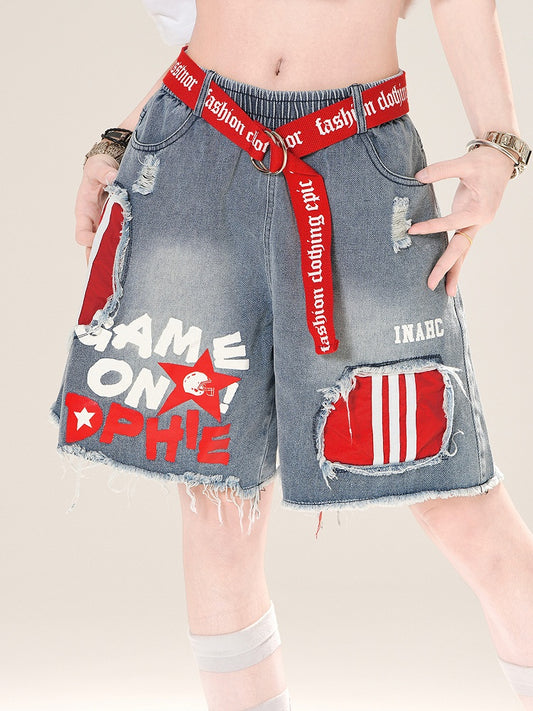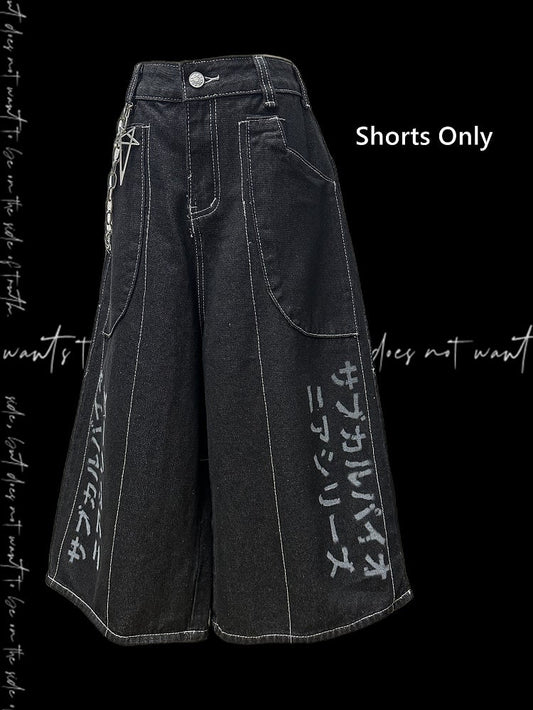 Jeansshorts Y2K Schwarzer Buchstabendruck Weites Bein