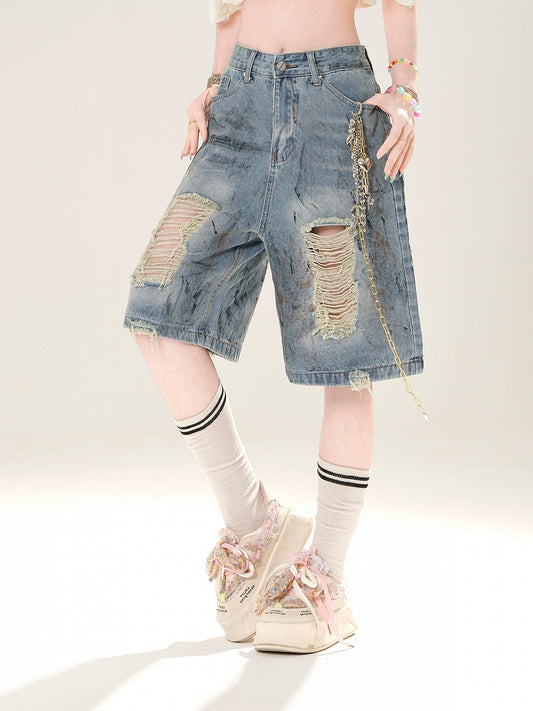 Blaue Denim-Shorts mit weitem Bein und verblassten Löchern im Scratch-Waschung-Look