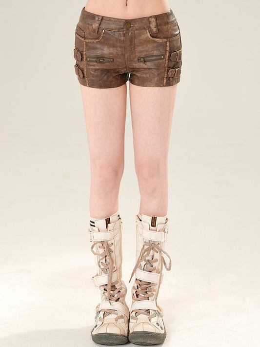 Verzierte braune Super Buckles Rise Low Mini Shorts