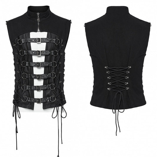 Gothic Black Strap Vest Accents and with Cross Buckle Academia Chain Knit