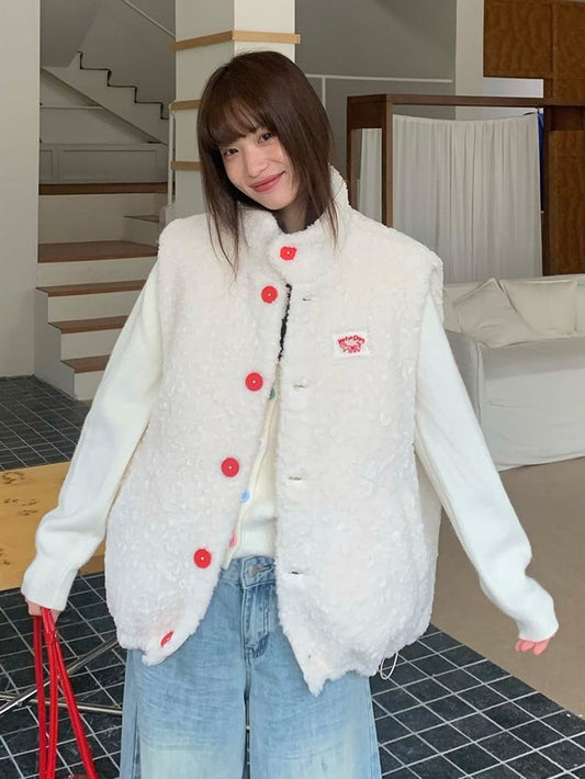 Kawaii Vest Daily Pink Closure Plush with Lining 2-Way Button Fleece Plaid Heart