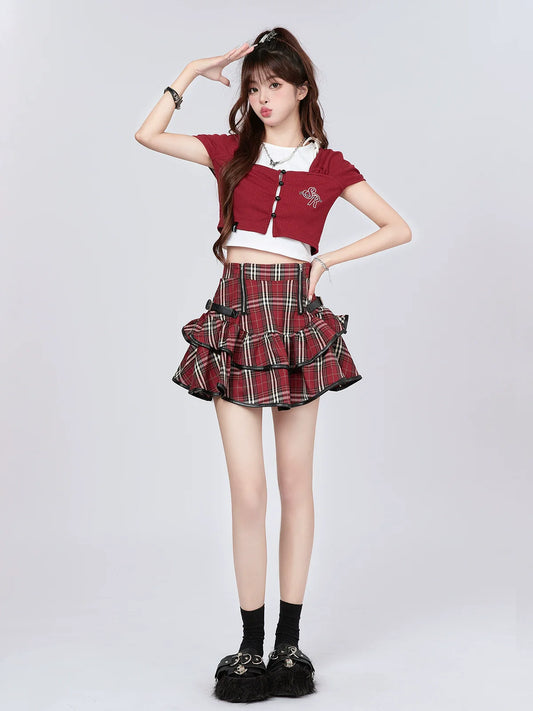 Chiffon-Jackenrock Retro + Band kariert Dunkel Feder Rock Shirt + Note Showa Brosche Kirschgrau