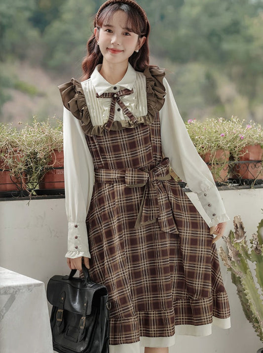 Brauner süßer Vintage-Mantel im Preppy-Stil mit Schleifenakzent und karierten Schaldetails