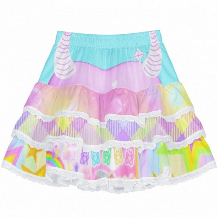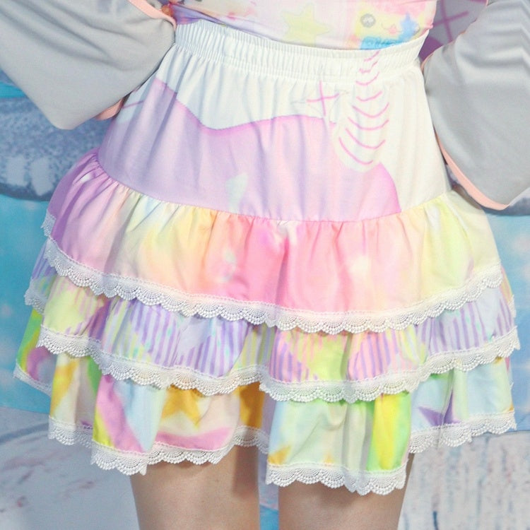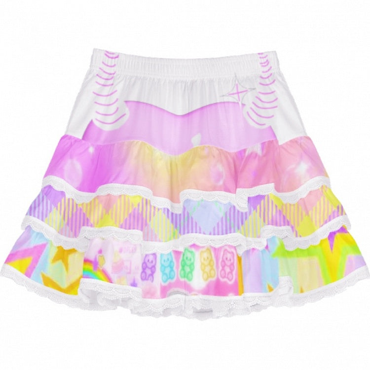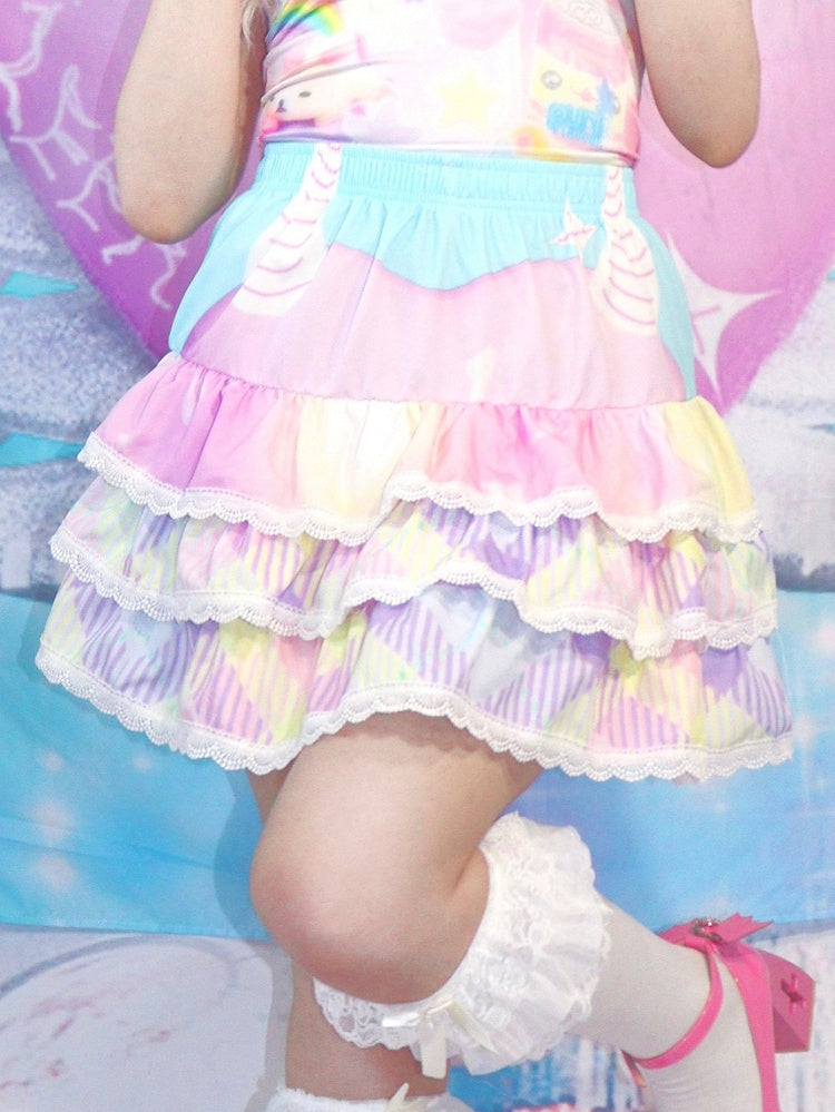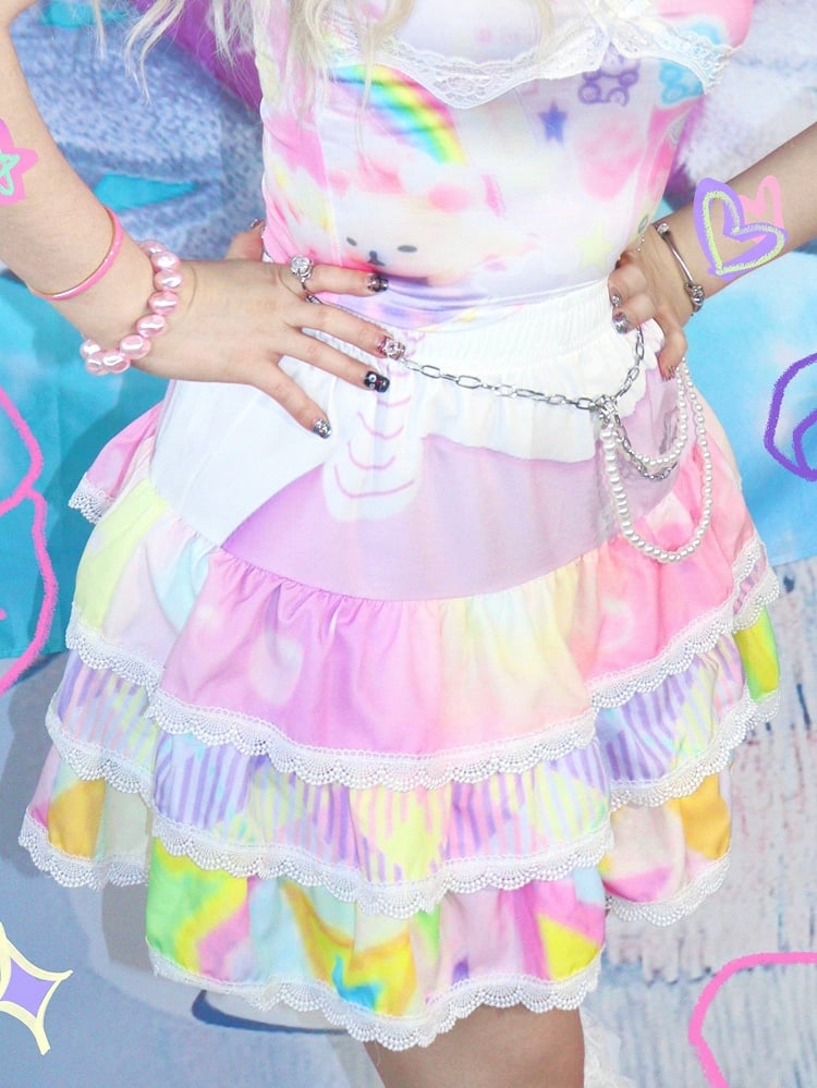 Weiß/Blau/Lila Y2K-Streifenmuster A-Linien-Stufenrock mit Spitzenbesatz