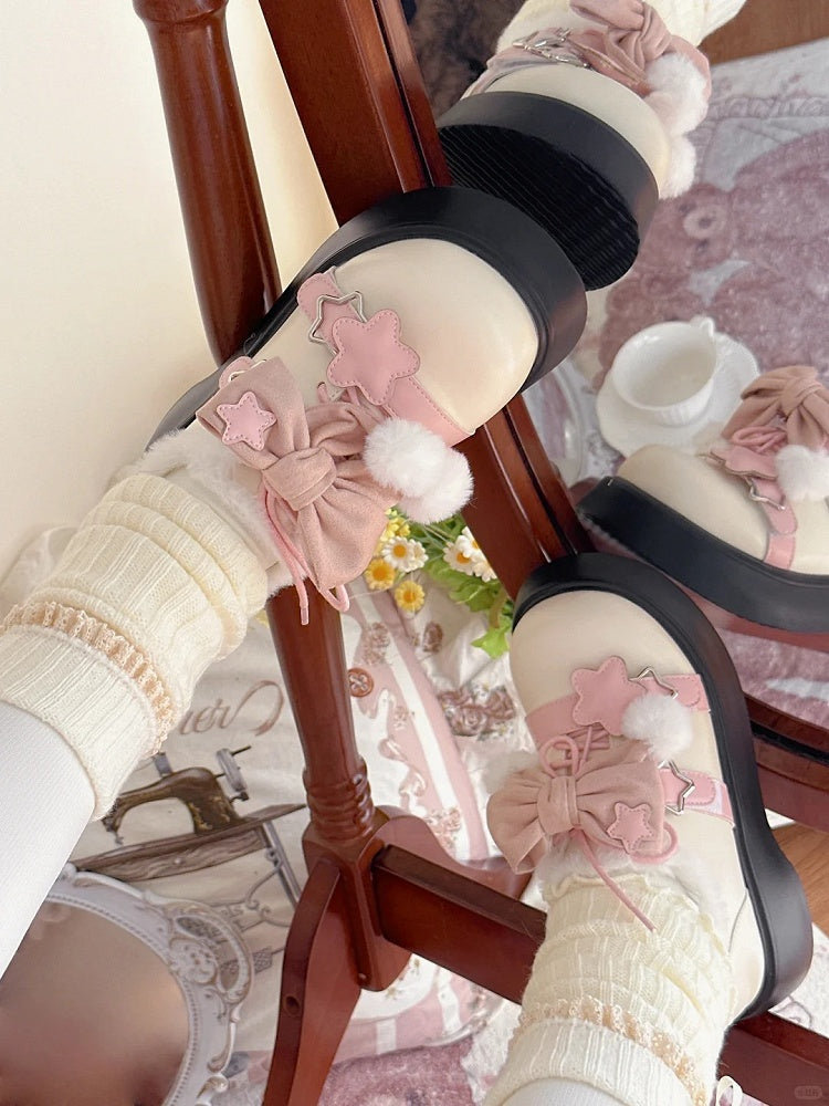 Beigefarbene, winterliche Plateauschuhe mit Fleecefutter – rosafarbene Sternakzente, abnehmbare Schleife und Pompon-Anhänger