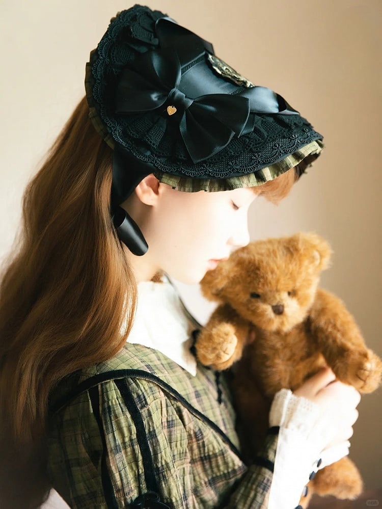 Grüne/rote Rose bestickte schwarze Lolita-Haube mit Schleifen-Akzenten