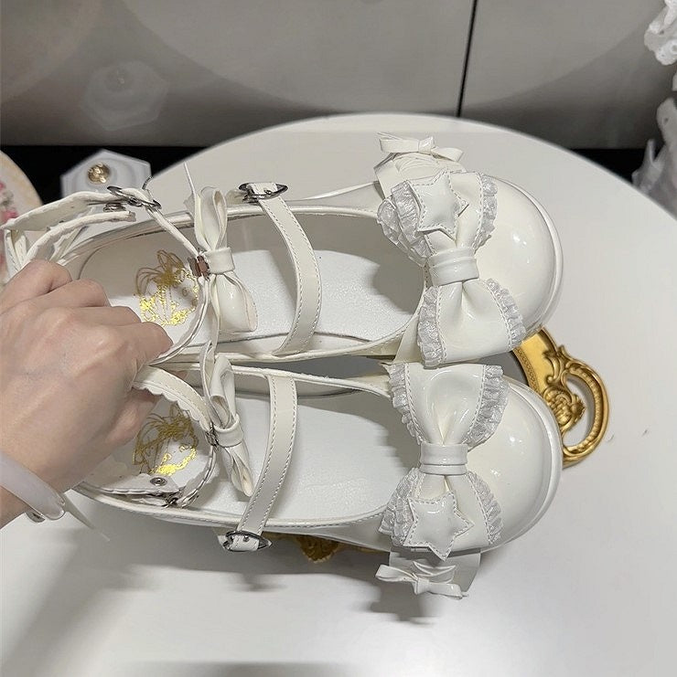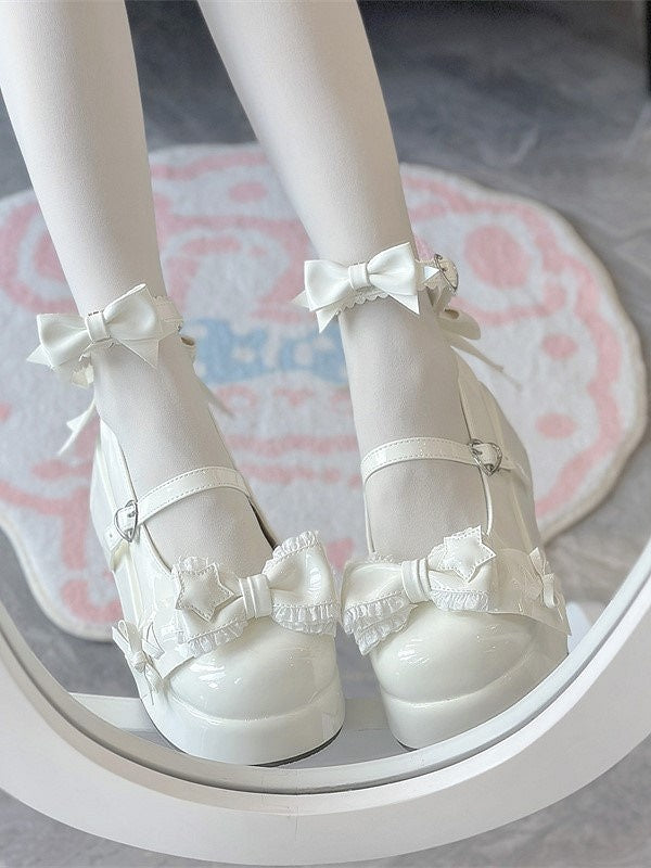White Sweet Lolita Style Round-Toe Platform Shoes with PU Leather & Bow Accents