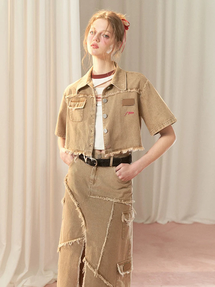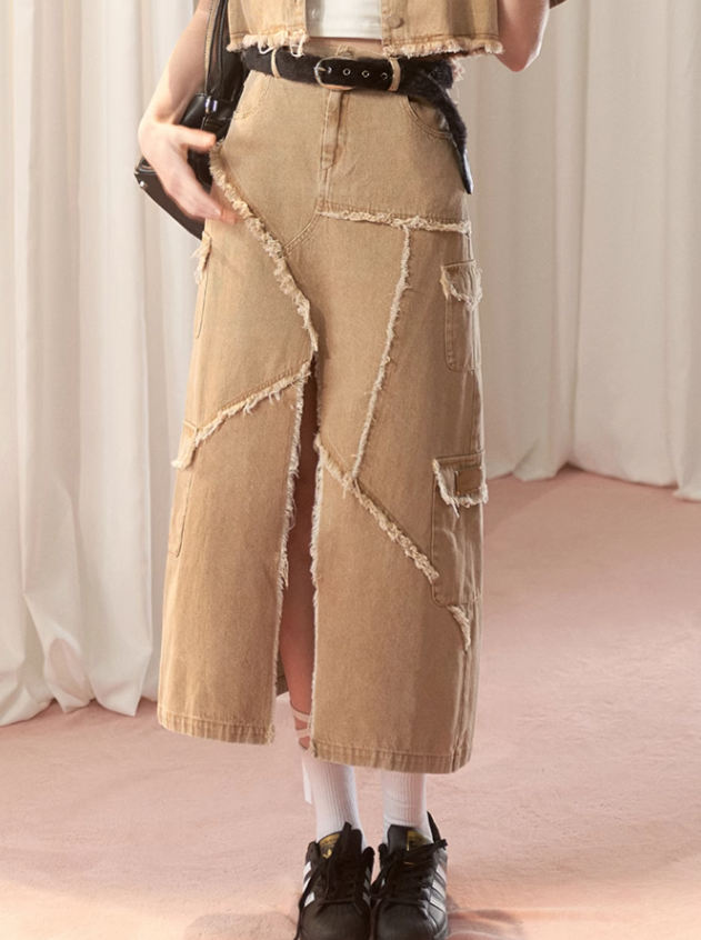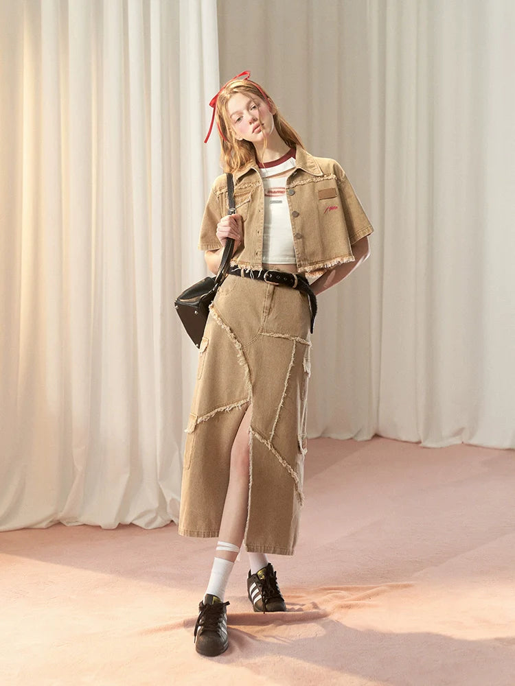 Dieses Set aus American Slit Skirt und Damaged Long Short Top verleiht Ihrer Garderobe einen Hauch von Niedlichkeit. Das einzigartige Schlitzdesign des Rocks und der Used-Look des Tops verleihen Ihrem Outfit einen verspielten Charme. Machen Sie sich bereit, mit diesem bezaubernden und stylischen Duo alle Blicke auf sich zu ziehen.