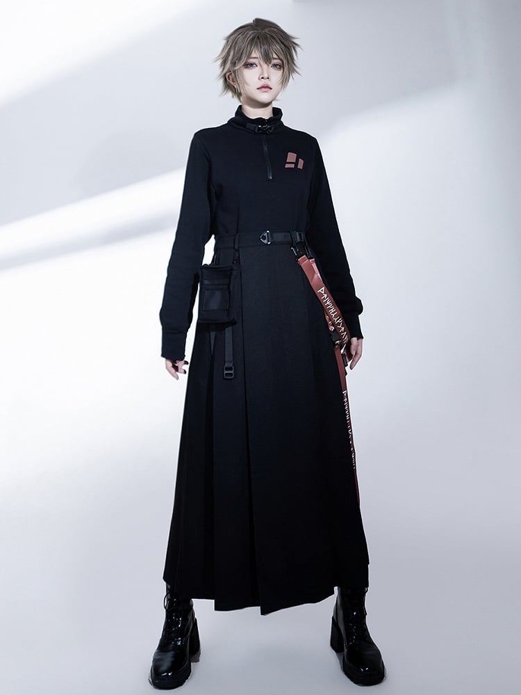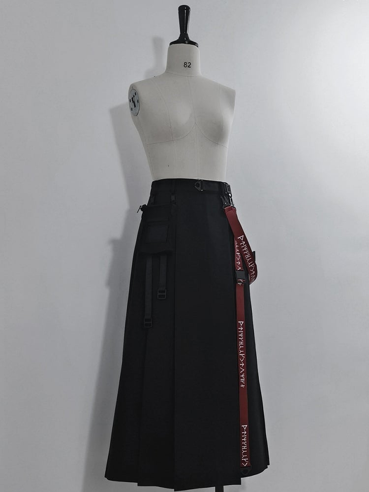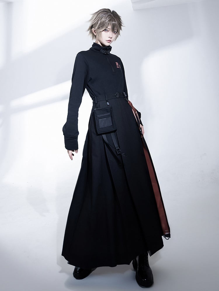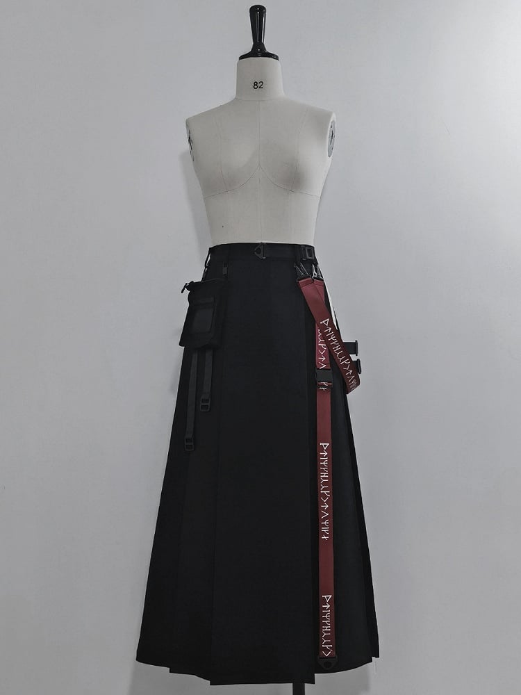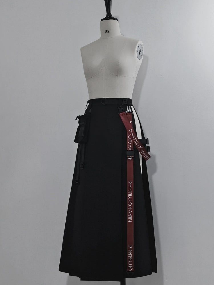 Schwarzer Cargorock mit hohem Schlitz, Trägern und Gürteltasche