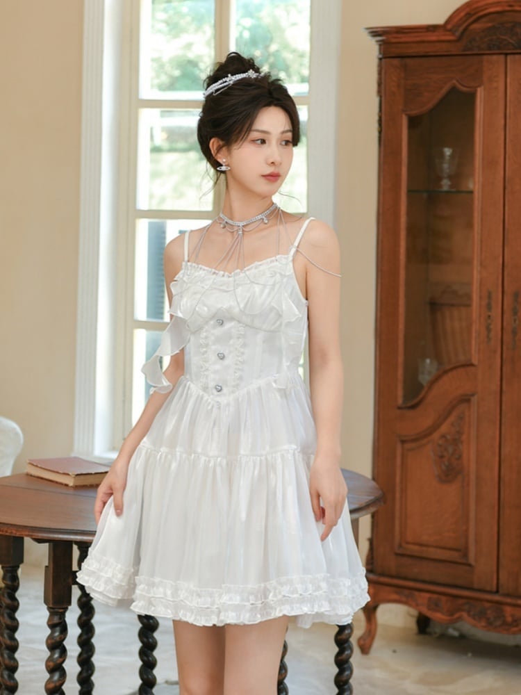 Weißes Shiro-Lolita-Kleid aus Satin mit abnehmbaren Ballonärmeln und Schleppe