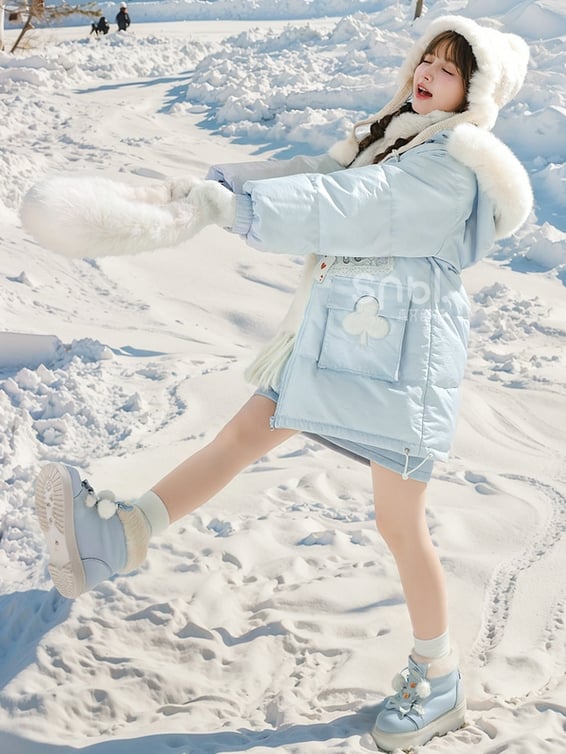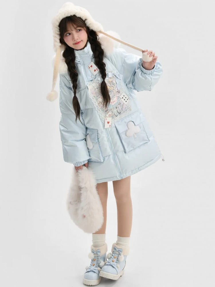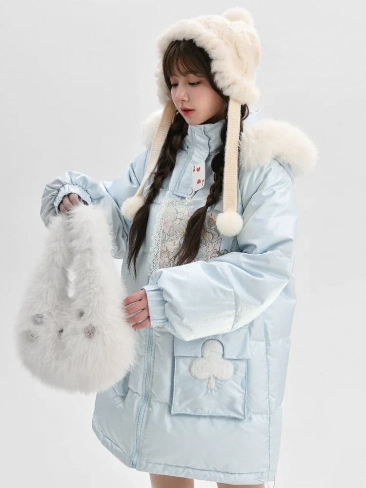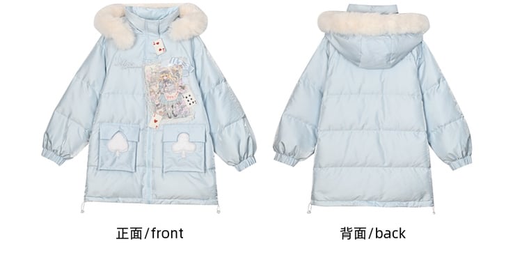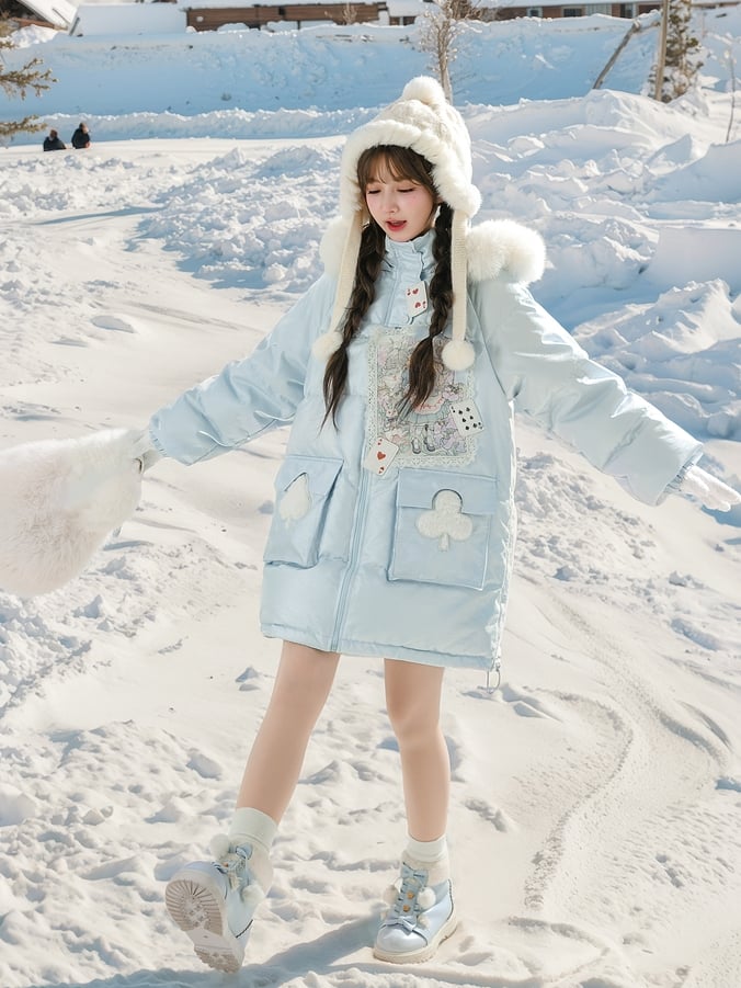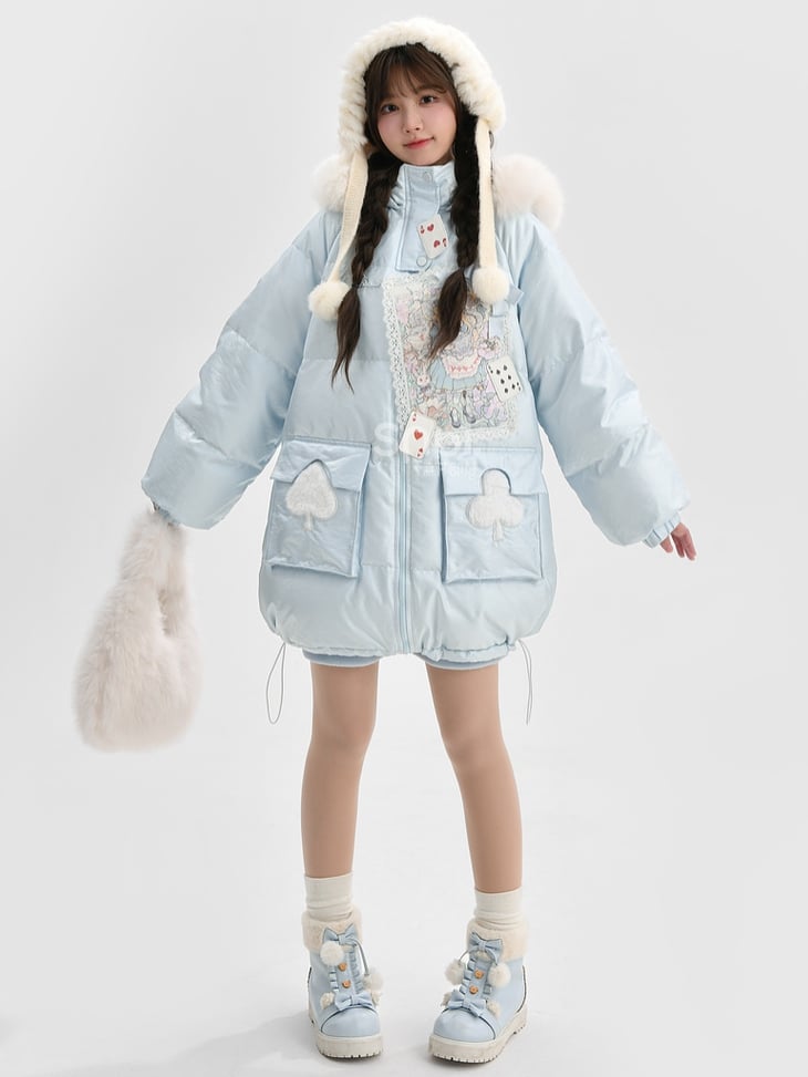 Bleiben Sie gemütlich und süß mit unserem blauen Daunenmantel mit Kapuze und Applikation. Mit seinem einzigartigen Applikationsdesign und der warmen Kapuzensilhouette sorgt dieser Mantel den ganzen Winter über für Stil und Komfort.