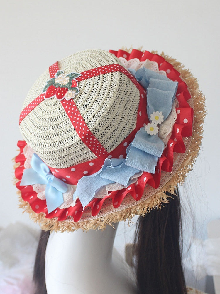 Roter Strohhut mit Erdbeerapplikation und Schleife