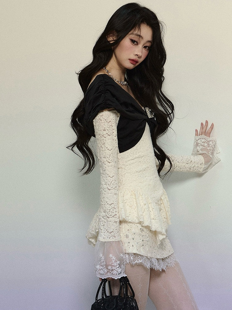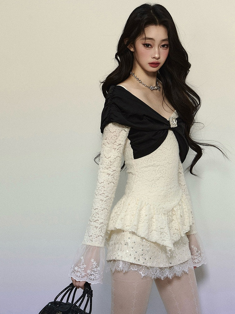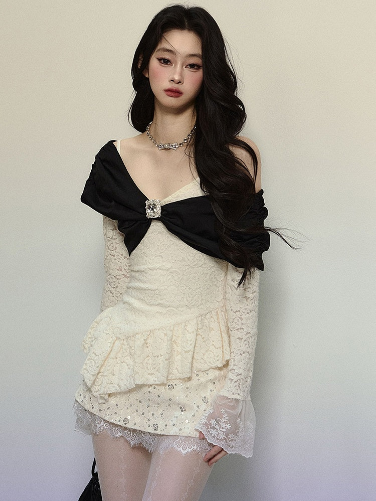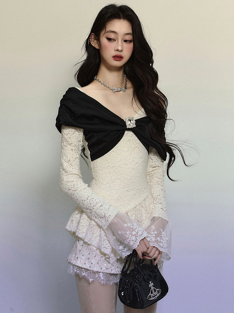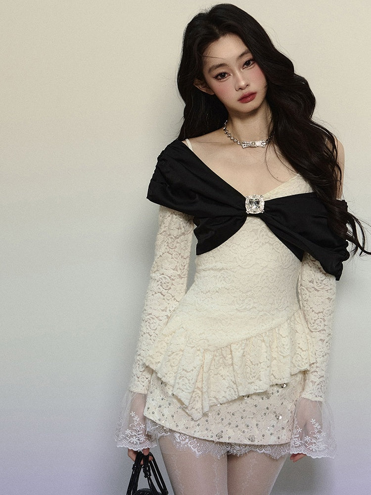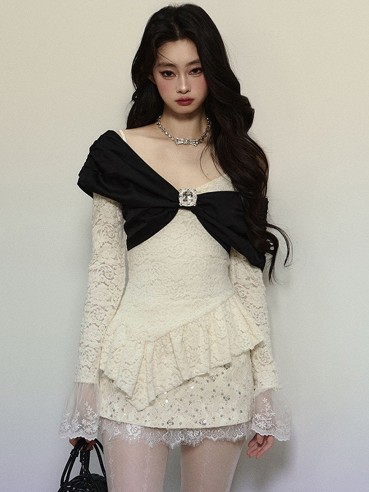 Dieses süße Top hat eine große Schleife und einen asymmetrischen Saum, gepaart mit einem V-Ausschnitt und langen Ärmeln für einen bezaubernden Look. Die Spitze verleiht einen Hauch von Eleganz und macht es perfekt für jeden Anlass.