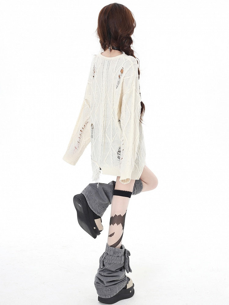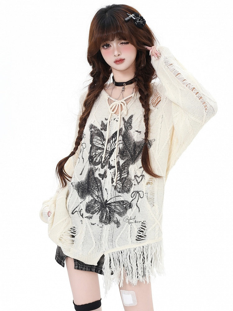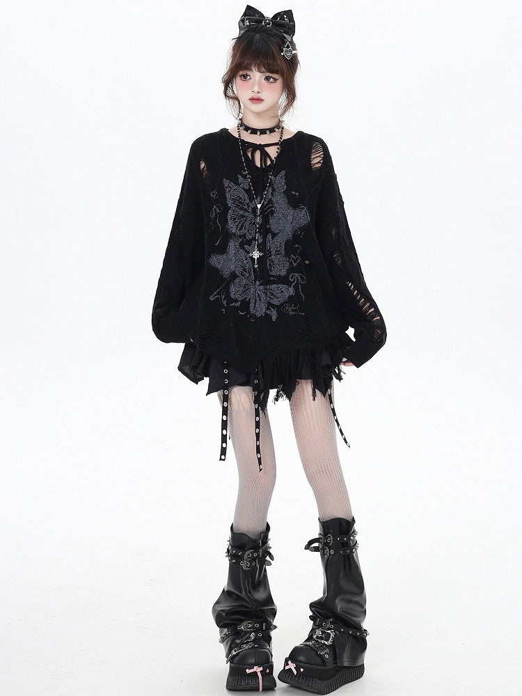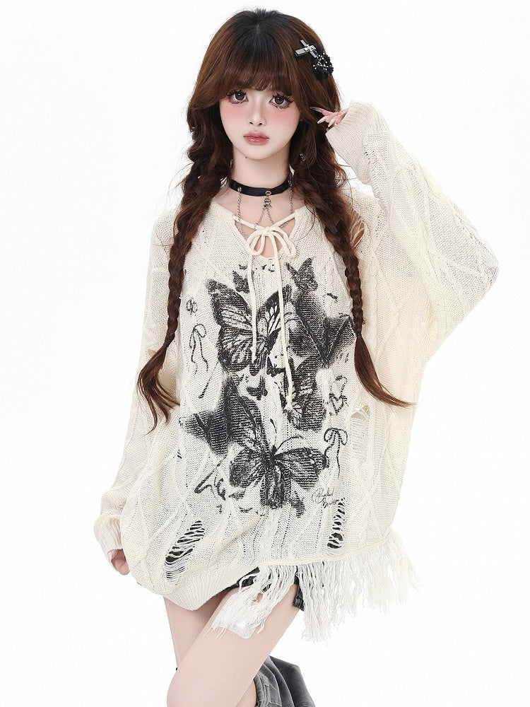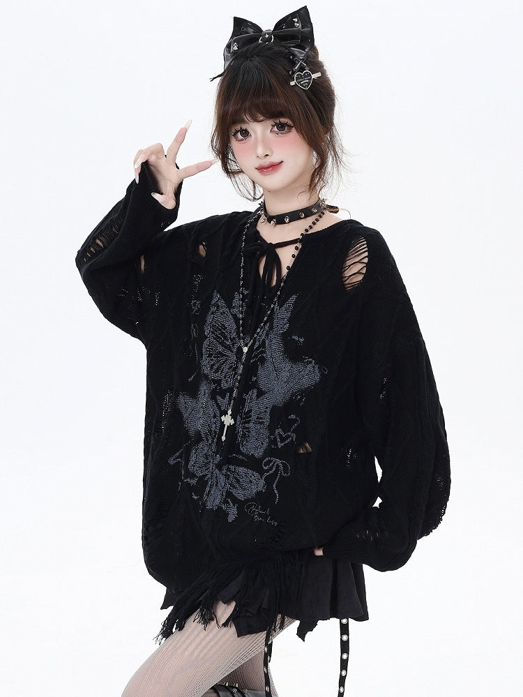 Aprikose/Schwarzes lockeres Strickoberteil mit Schmetterlingsmuster und Löchern im Used-Look und V-Ausschnitt