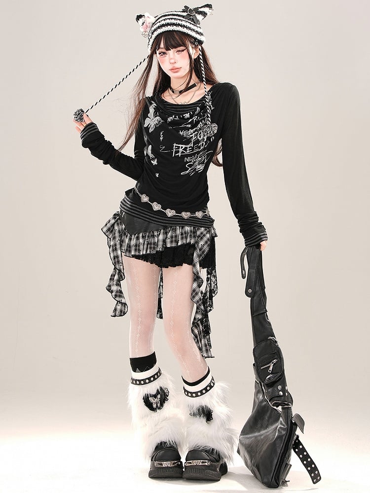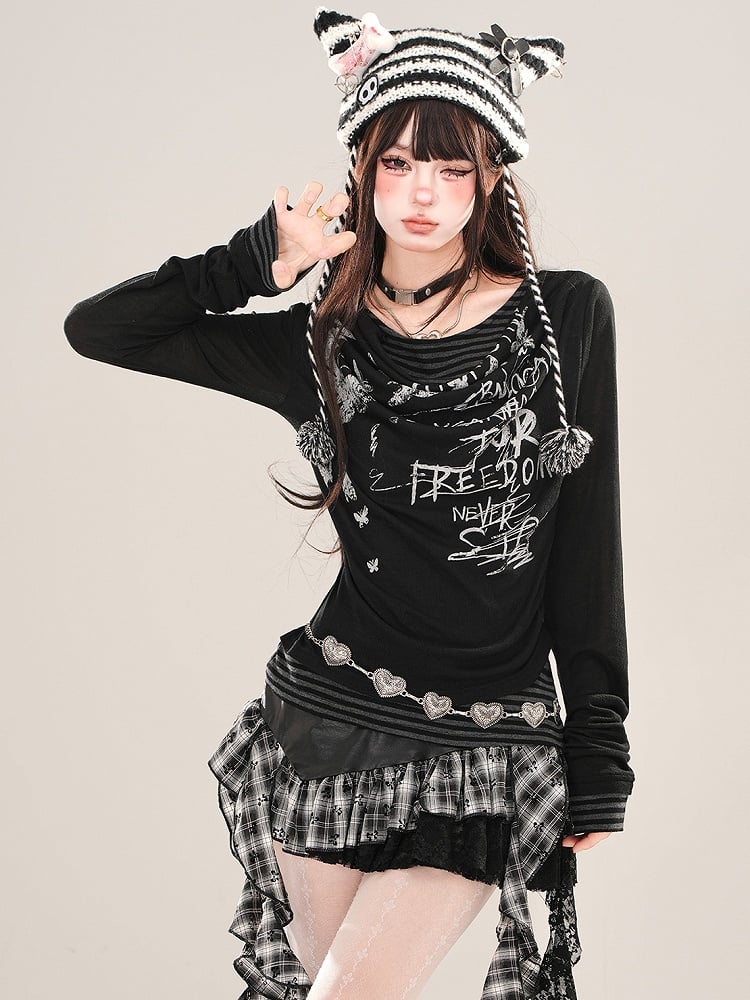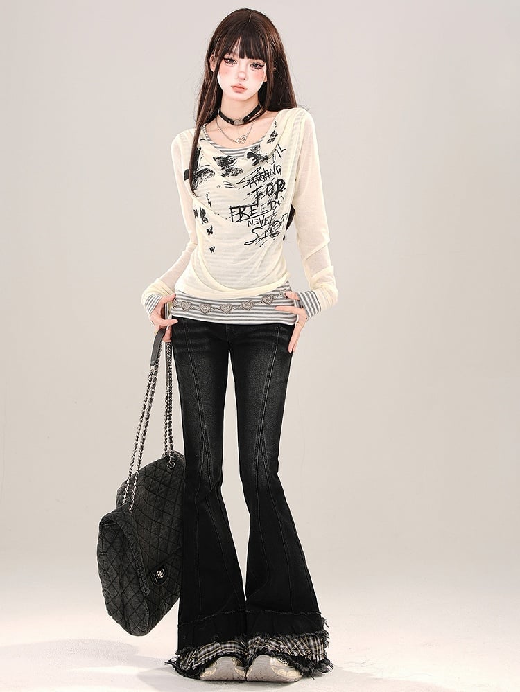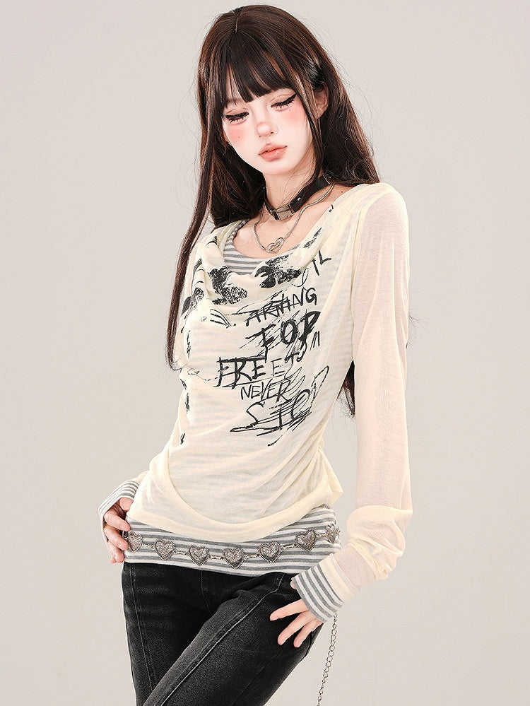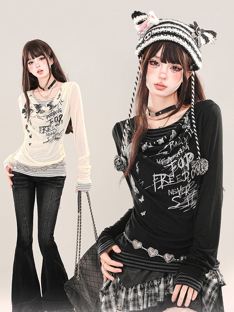 Aprikose/Schwarzes zweiteiliges, gestreiftes Langarm-Oberteil mit grafischem Netzstoff