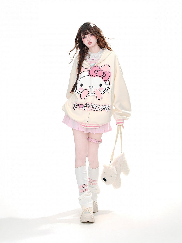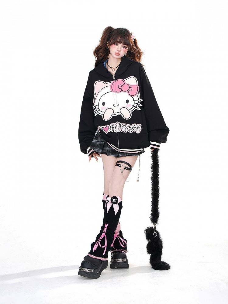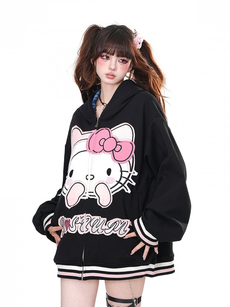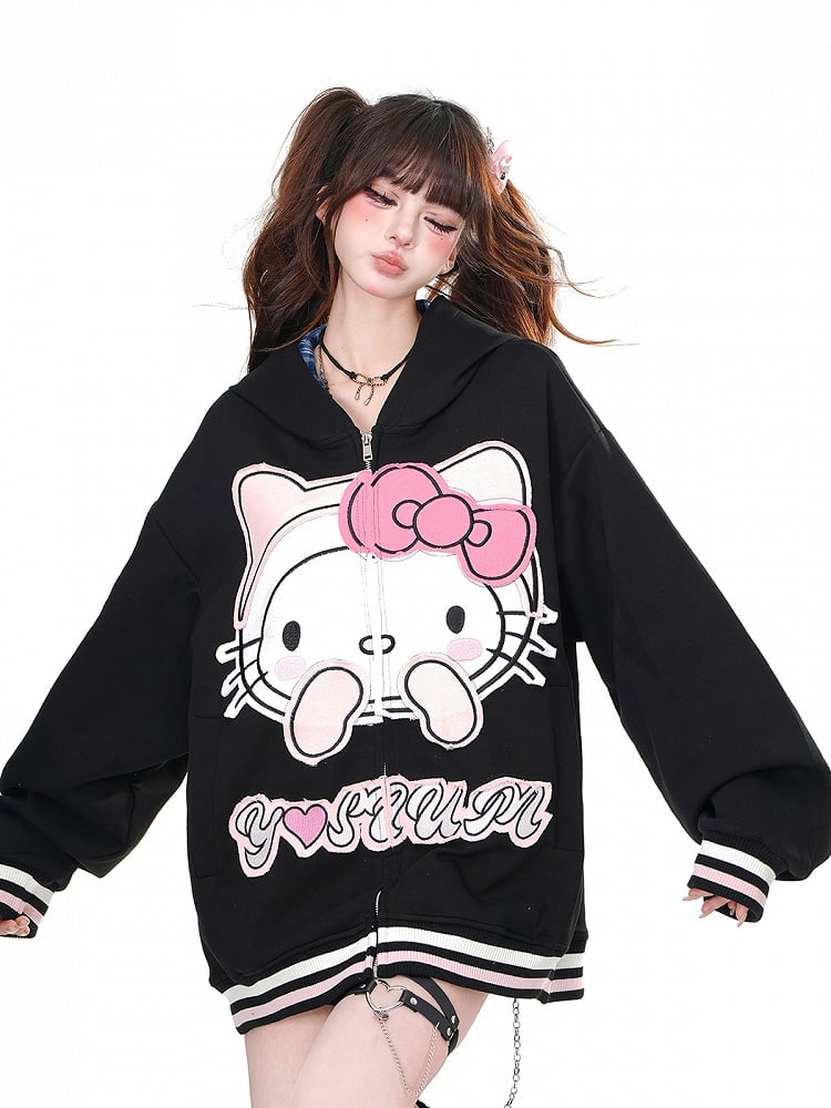Gönnen Sie sich diesen bezaubernden Oversize-Hoodie mit aufgesticktem Kätzchen-Design in Aprikose und Schwarz. Halten Sie sich warm und verleihen Sie Ihrem Outfit mit dem Reißverschluss einen Hauch von Niedlichkeit. Perfekt zum Entspannen oder für einen entspannten Tagesausflug.