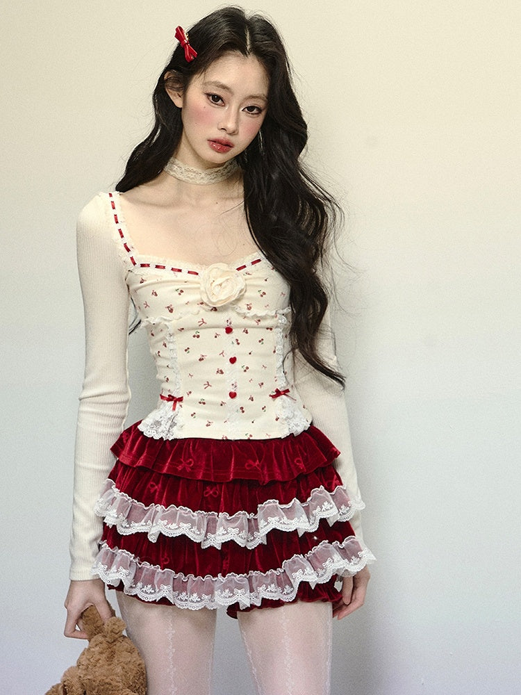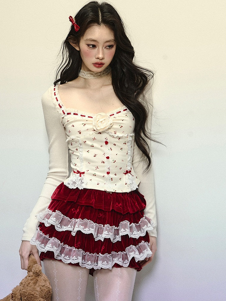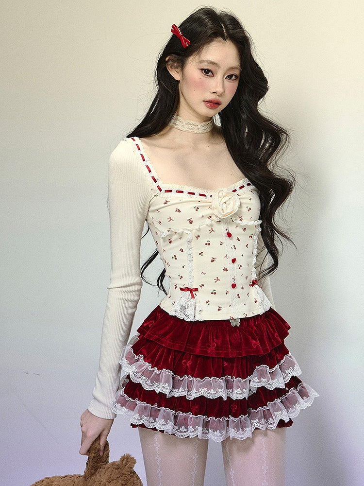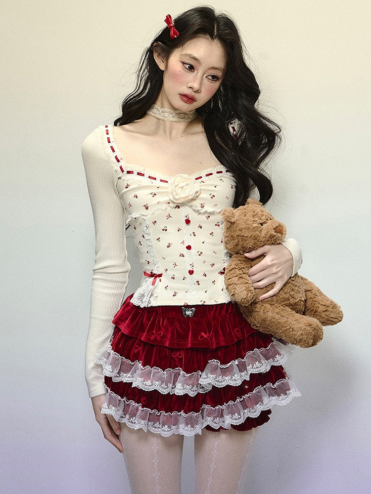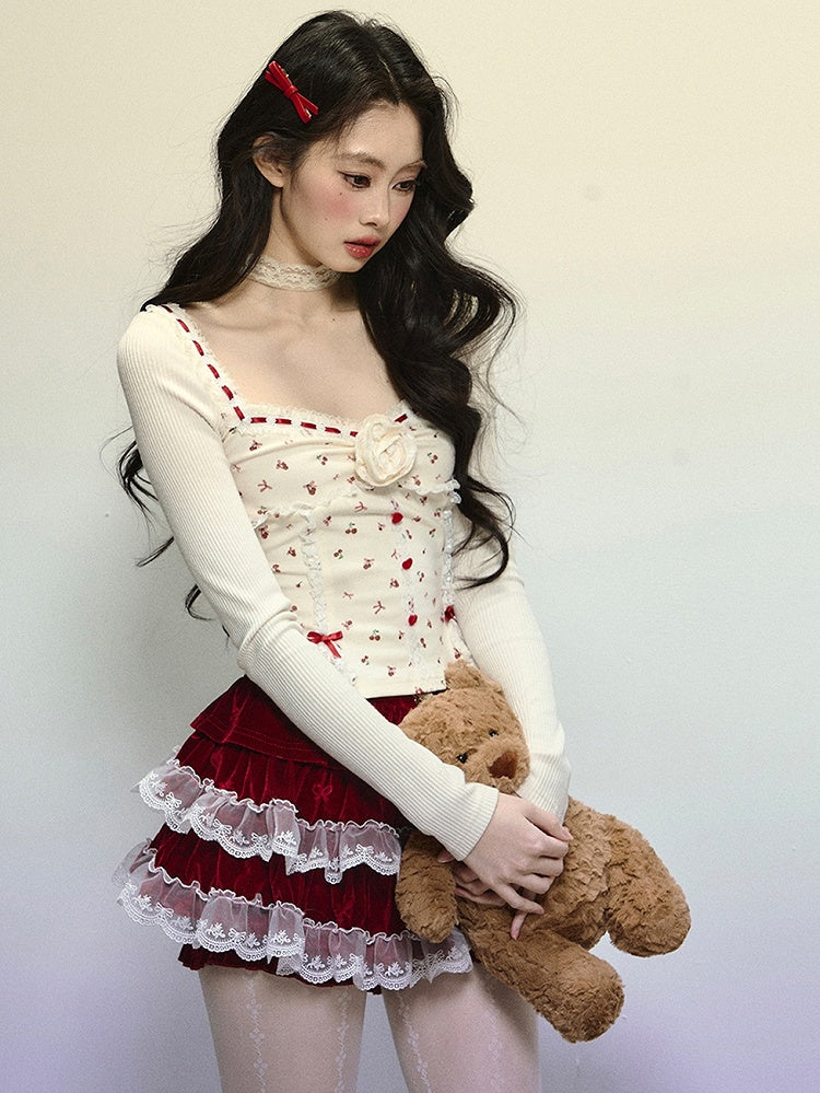 Aprikosenfarbenes Oberteil mit Blumenmuster, Kirschen und Schleife, Spitzenakzenten und quadratischem Ausschnitt