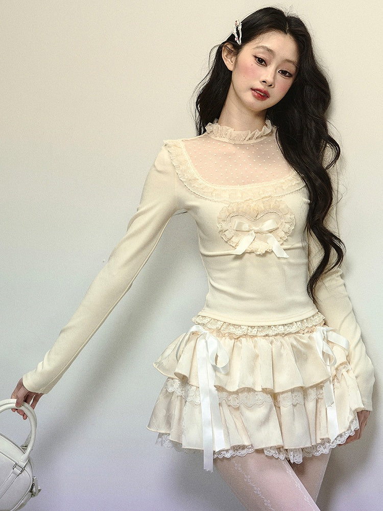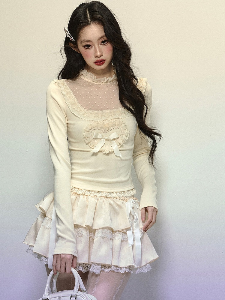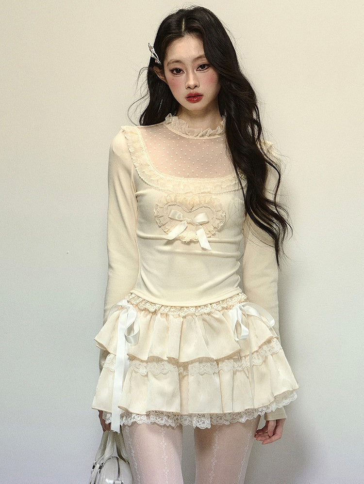 Aprikosenfarbenes Oberteil mit Illusionsausschnitt und Spitzenakzenten und langen Ärmeln